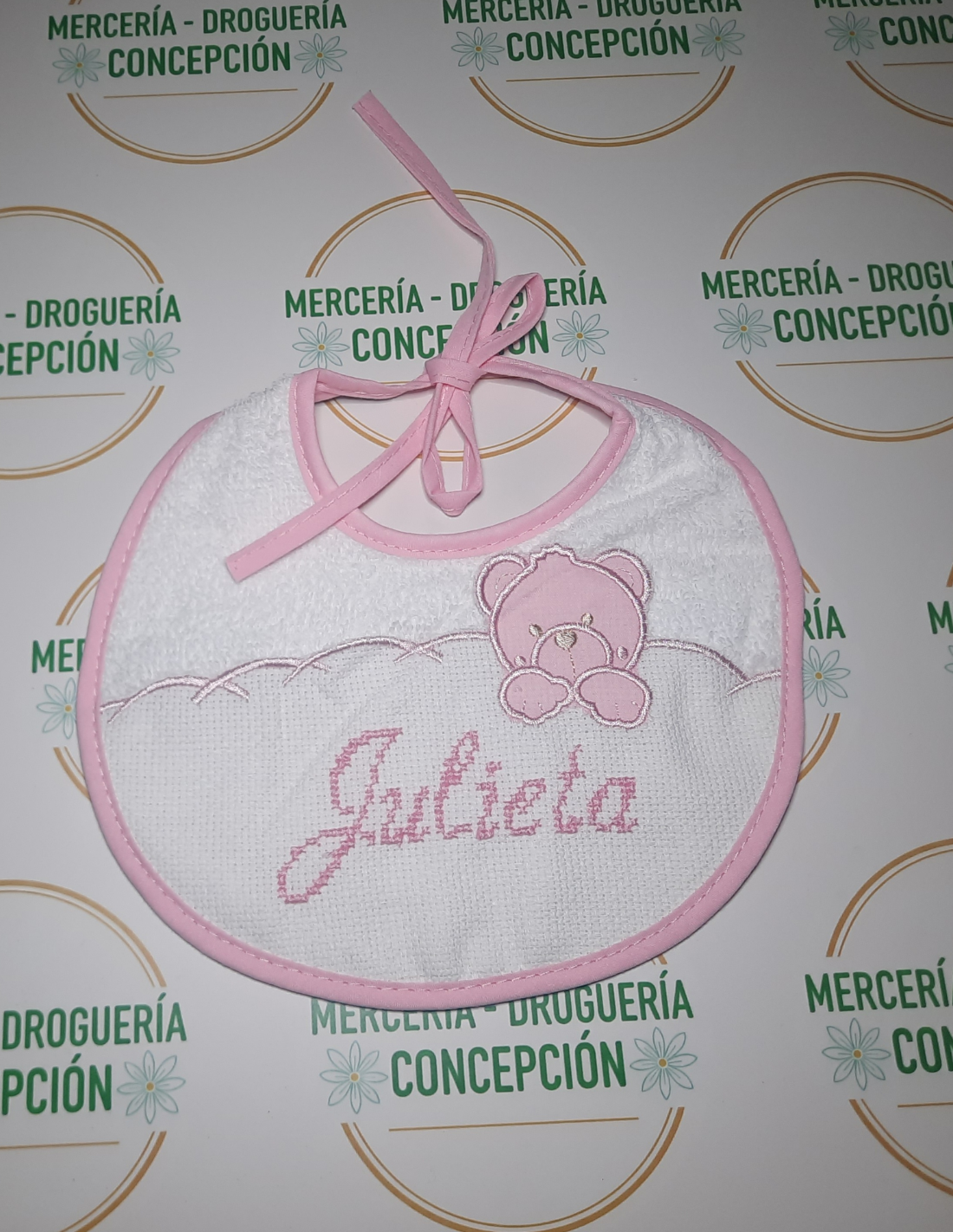 - Personalización: nombre bordado en letras de punto de cruz.